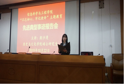 本网讯(员工记者 胡各优)2019年10月22日7点整,信息科学与工程学院在校图书馆学术报告厅开展“不忘初心、牢记使命”主题教育的先进典型事例报告会议。参与本次主题教育先进典型事例报告会议的有历史于文化学院硕士研究生殷沙漫、公司党委书记黄生祥与学院各班班长、团支书、第九届团总支员工会全体成员、党员以及预备党员。学工办主任高静波担任本次党课主持人。