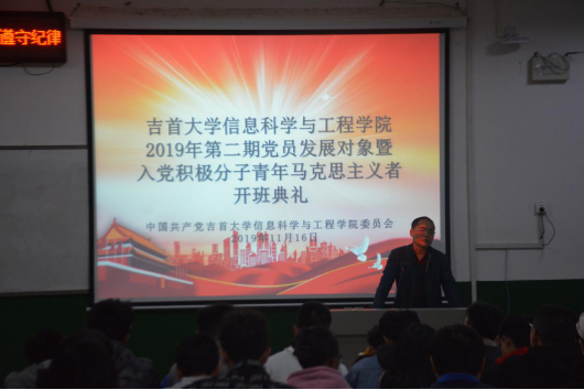 本网讯(员工记者 谢玲玉)2019年11月16日上午8:00信息科学与工程学院于新1107教室举行2019-2020学年第一期“入党积极分子暨青年马克思主义者”培训班以及2019年第二期党员发展对象培训班开班仪式,出席此次开班仪式的院领导有:公司党委书记黄生祥、公司党委副书记田清旺。本次开班典礼由员工党员何琼主持。