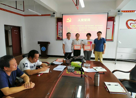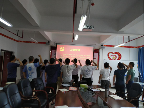 首先,在杨川同志带领全体党员重温入党誓词。党员们整齐列队,右手握拳举起,神情庄重,跟着杨川同志宣读誓词,感悟誓词。