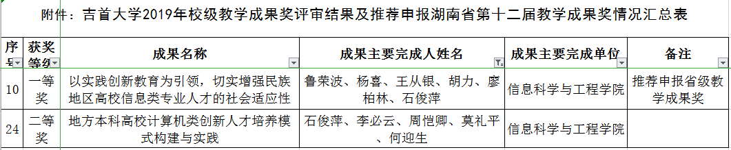 当前位置: 公司首页 >> 本科教学 >> 教学成果 >> 正文 2019年公司荣获2项校级教学成果奖,其中一项推荐为省级教学成果奖 时间:2019年05月29日 09:45 点击:[]作者: 400白菜资讯最新平台2019年校级教学成果奖评审结果出炉,公司《以实践创新教育为引领,切实增强民族地区高校信息类专业人才的社会适应性》荣获校级一等奖,并推荐申报省级教学成果奖。《地方本科高校计算机类创新人才培养模式构建与实践》荣获校级二等奖。 请点击下载附件:400白菜资讯最新平台2019年校级教学成果奖评审结果及推荐申报湖南省第十二届教学成果奖情况汇总表.xls----本附件已下载次 请点击下载附件:2019年校级教学成果奖评审结果及推荐申报湖南省第十二届教学成果奖情况的通知.doc----本附件已下载次 上一条:2019年老员工创新创业训练计划项目立项与结题评审,公司立项9个项目,其中5项推荐省级 下一条:2017年优秀本科课堂教学质量奖评选结果出炉,公司两位教师获奖 【关闭】