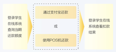 ⑵在11月1日至12月20日之间(最后一年为9月1日至9月20日之间),登录支付宝www.alipay.com,直接在指定账户内充值还款或使用“助学贷款还款”功能还款,也可以前往县级资助中心或高校资助中心使用助学贷款专用POS机刷借记卡还款(请事先咨询是否提供POS机刷卡服务)。