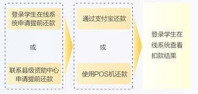 ⑴可以到县级资助中心或登录员工在线服务系统申请一次性还清一份或多份《借款合同》尚未清偿的所有助学贷款本金及相应利息;也可以申请提前偿还部分本金(必须为人民币500元以上、且为100元的整数倍数的金额)及相应利息。申请后需尽快前往就近的县级资助中心或高校资助中心使用助学贷款专用POS机刷借记卡还款或在支付宝账户内充值还款。