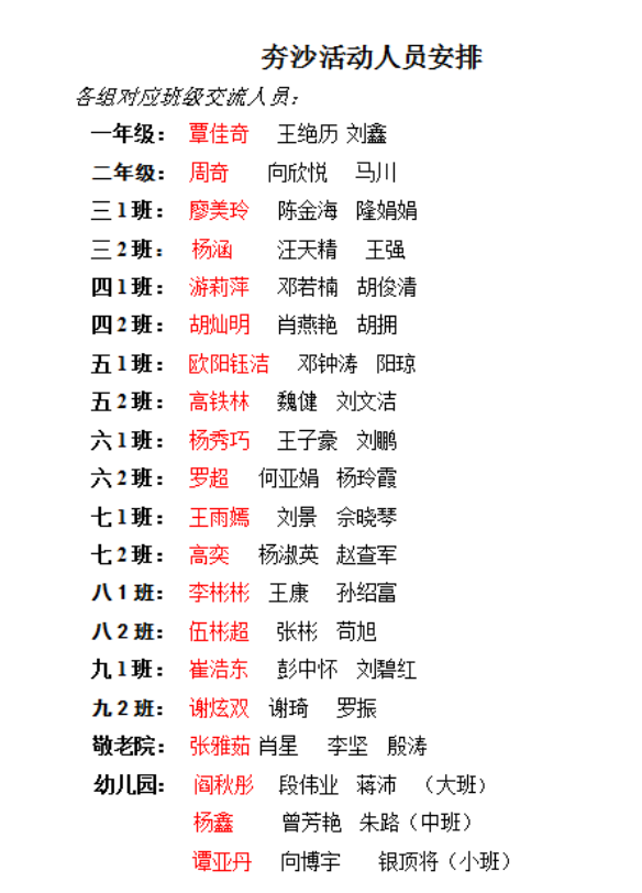 (2)约10点30分到达夯沙学校,11点左右进行下班级活动,由各组长带领自己的队员下班级与夯沙学校的员工进行交流。中餐在夯沙学校食堂统一开餐。中餐后各小组分工布置会场。