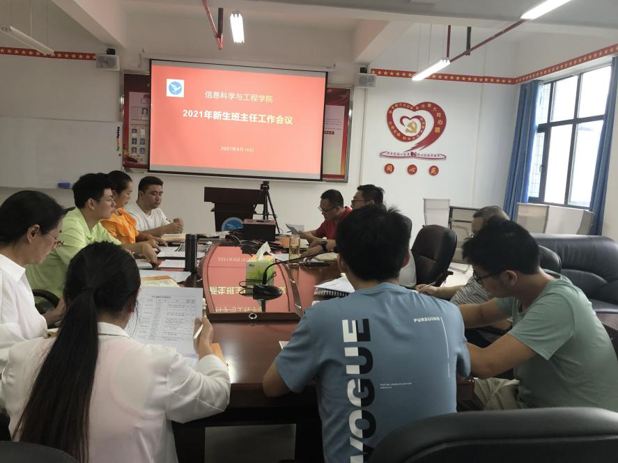 2021年9月16日中午12:30,为更好地展开迎新工作,公司在工科大楼C327召开信息科学与工程学院2021级新生班主任工作会议,出席会议的有公司党委副书记王伟,2020级辅导员滕交,2021级辅导员阳帅、辅导员祖力甫哈尔·亚科甫级2021级各班班主任,会议由学工办主任杨川主持。