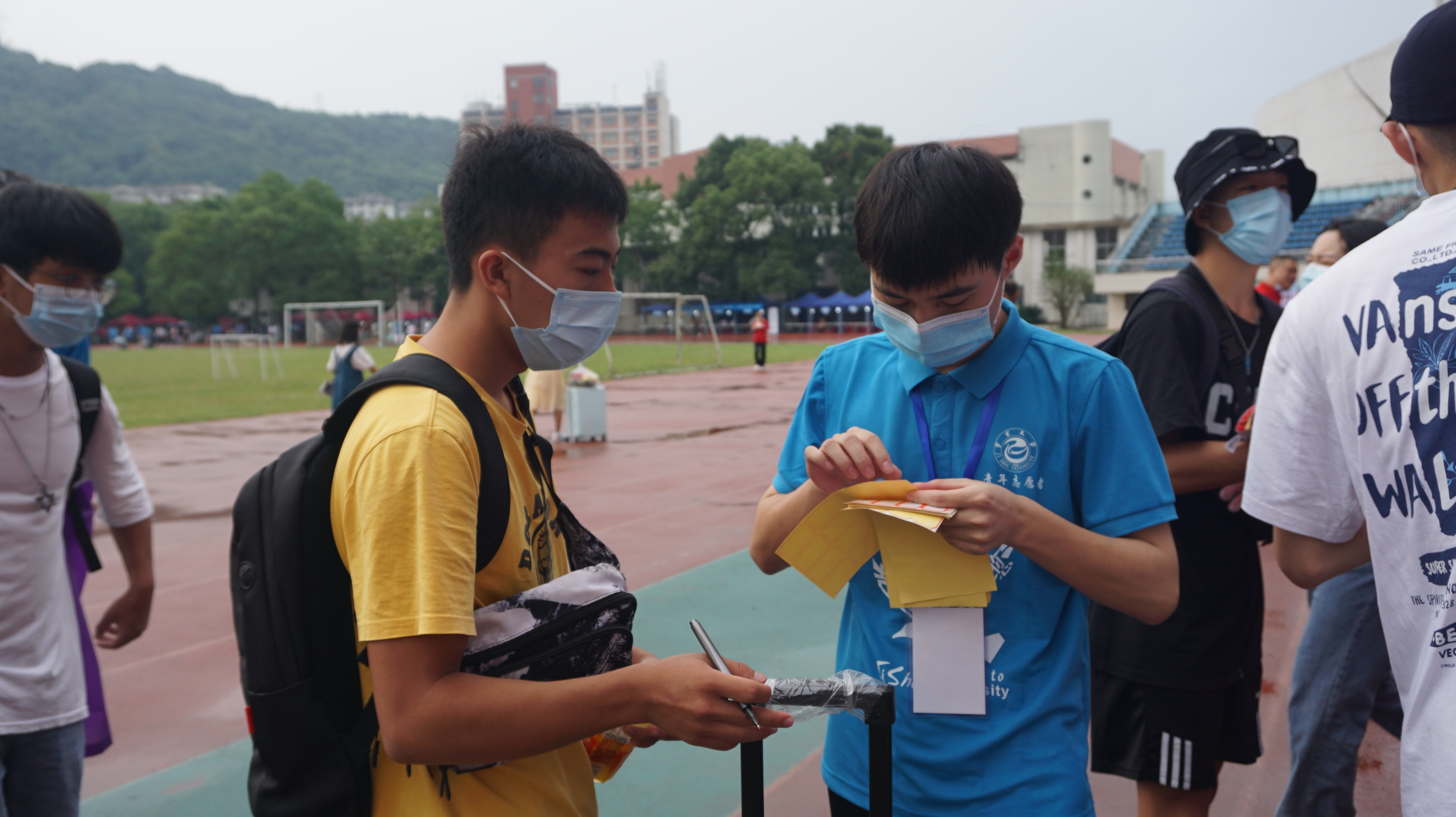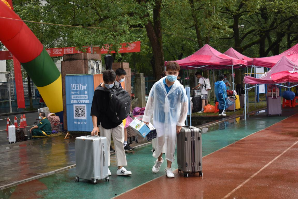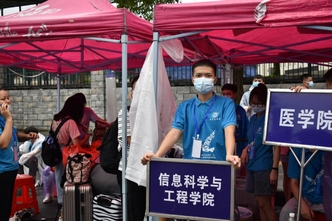 早在清晨六点半,志愿者们便早早到场、各司其职,举标识牌、迎接并引导新生、看管行李、核对新生信息……到处都有他们忙碌的身影。纵然秋雨连绵,可志愿者们迎新的热情丝毫不减,他们披上雨衣继续穿梭在迎新一线,为新生撑伞、搬运行李。这几场风雨来得意外,但风雨之中,志愿者们帮助新生的情谊更显得弥足珍贵,志愿者们口罩之下的笑颜也更显得温情。