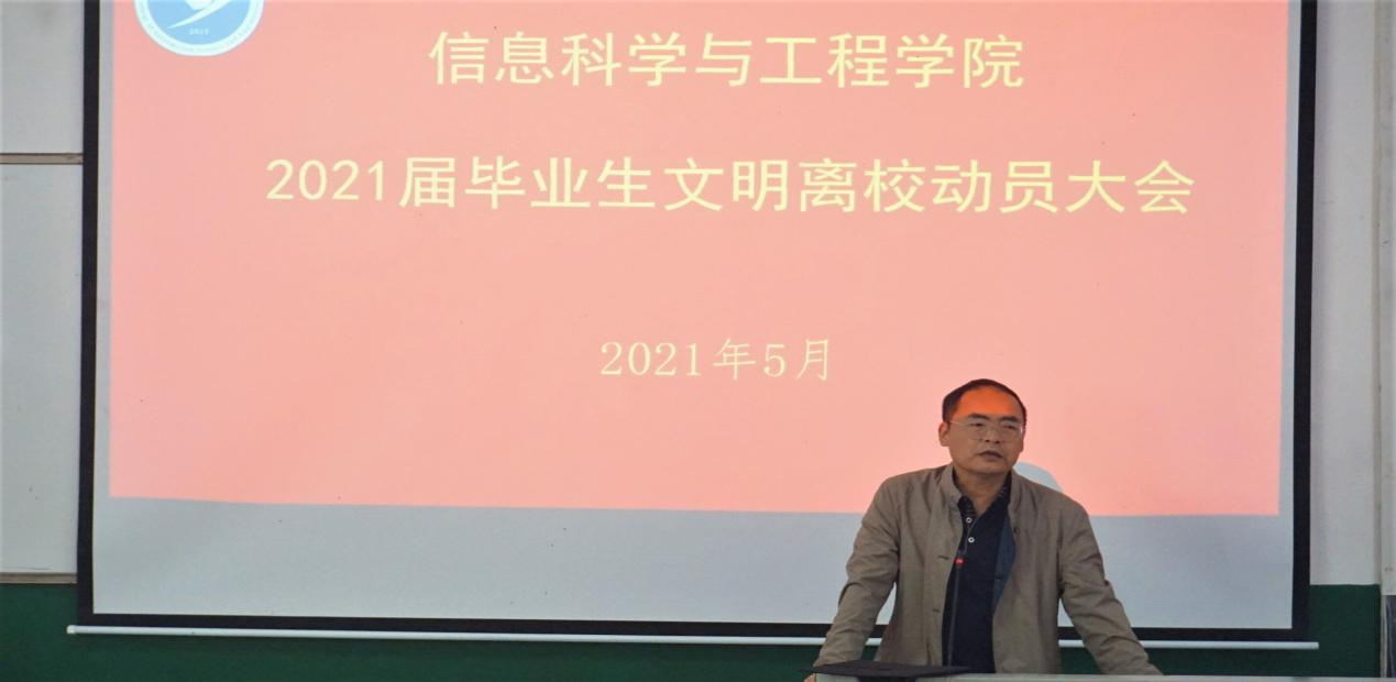 为确保公司毕业生离校工作平稳有序的推进,2021年5月19日下午15:00,公司于第一教学楼1107和1206教室召开信息科学与工程学院2021届毕业生文明离校动员大会,出席本次大会的领导和老师有党委副书记田清旺、学工办主任杨川、团总支书记郑迅、就业专干何剑和资助专干滕交,2017级全体毕业班员工参与此次大会,本次大会由学工办主任杨川主持。