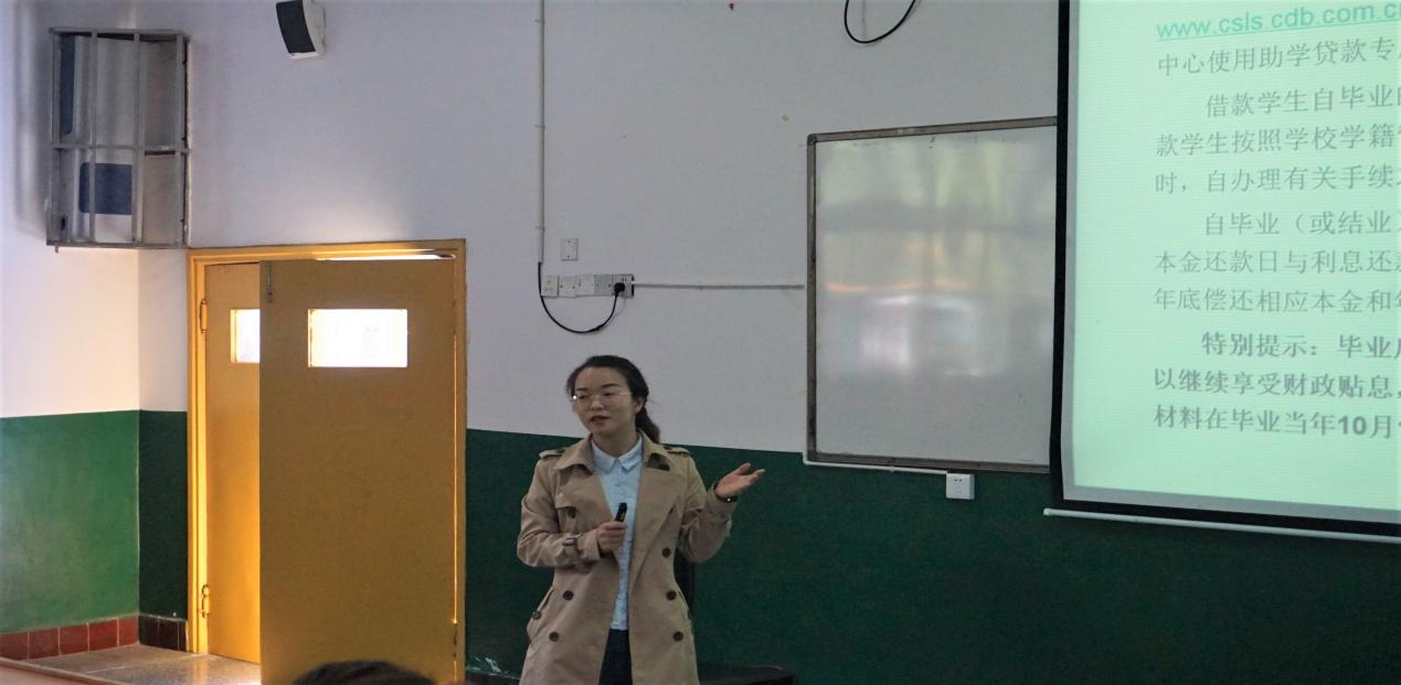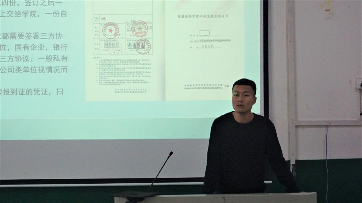 随后,团总支书记郑迅、资助专干滕交和就业专干何剑分别就毕业生党团组织的转接步骤和智慧团建的使用、国家助学贷款还款事宜和诚信个人征信的重要性、毕业生就业协议书的签订和就业的注意事项等多个方面的内容进行详细的说明。