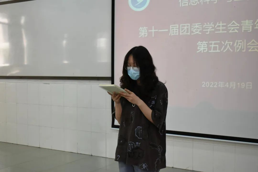 团委副书记李新然强调青年大学习的重要性,提出疫情期间为保证同学们学习、生活有序开展,要严格落实学校的疫情防控任务,及时上交健康码和行程码,各班班级负责人要落实班级同学的核酸检测情况。