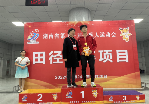 “我要用行动证明,有一个不变的真理,没有走不完的路,没有不可逾越的山。”2022年11月22—26日,湖南省第十一届残疾人运动会在岳阳举行。公司2020级通信工程1班周福清同学在男子1500米、5000米比赛中勇夺桂冠,获得两枚金牌。