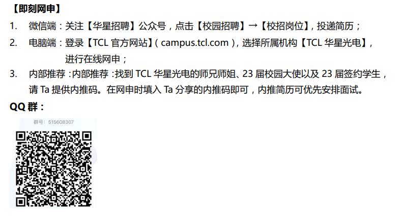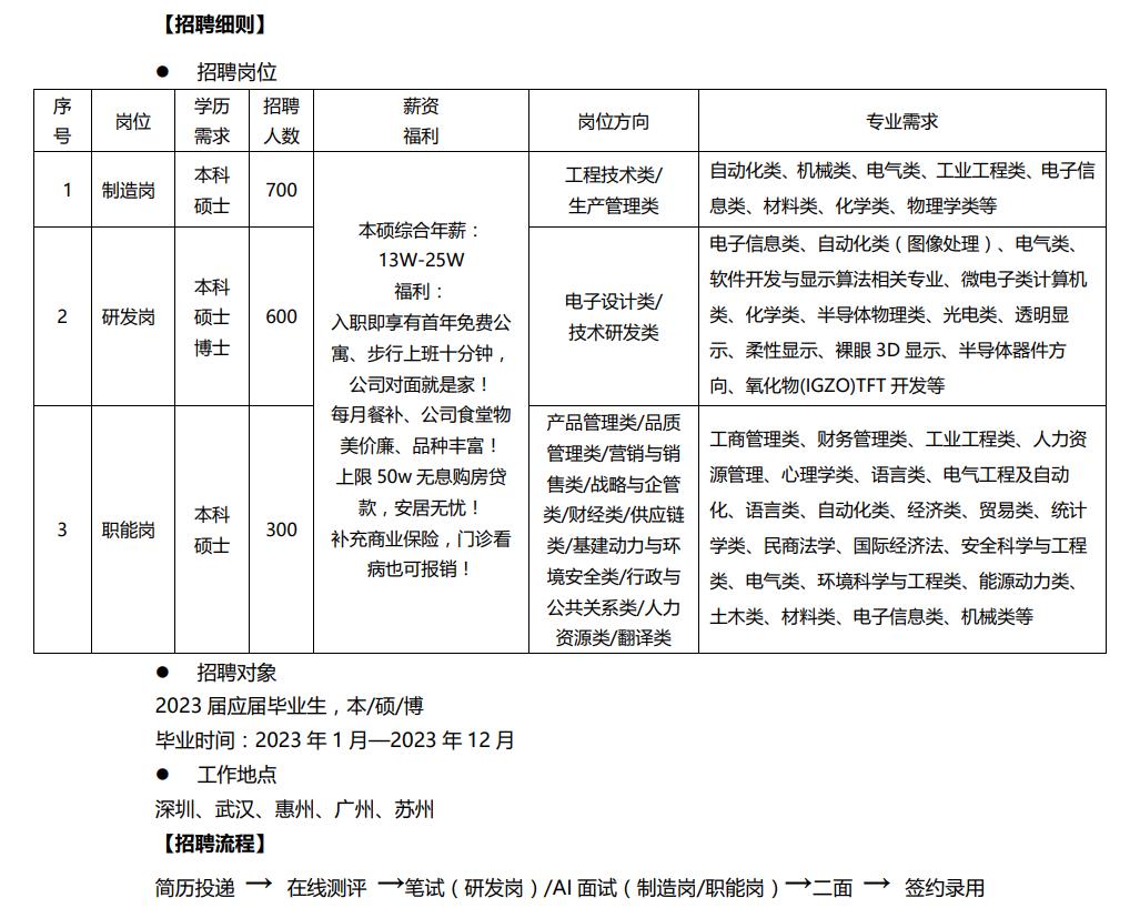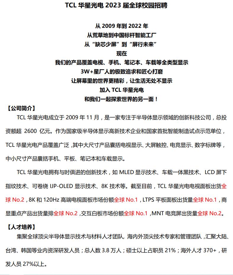 当前位置: 公司首页 >> 人才招聘 >> 就业信息 >> 正文 TCL华星光电2023届校园招聘 时间:2022年11月08日 15:14 点击:[]作者: 请点击下载附件:TCL华星光电2023届校园招聘招聘简章(1).pdf----本附件已下载次 上一条:广州市保伦电子有限公司2023届校园招聘 下一条:公司与湖南一树网络有限公司等五家企业签订校外实习基地共建协议 【关闭】