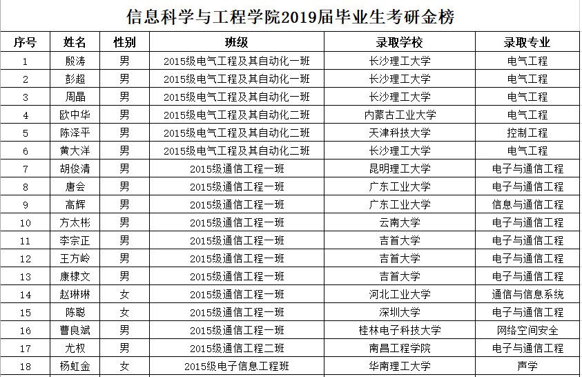 当前位置: 公司首页 >> 人才招聘 >> 优秀毕业生 >> 正文 信息科学与工程学院2019届毕业生考研金榜 时间:2019年05月10日 10:17 点击:[]作者: 请点击下载附件:信息科学与工程学院2019届毕业生考研金榜.xls----本附件已下载次 上一条:信息学院2019届优秀毕业生事迹 下一条:信息科学与工程学院2019届400白菜资讯最新平台优秀毕业生推荐名单公示 【关闭】