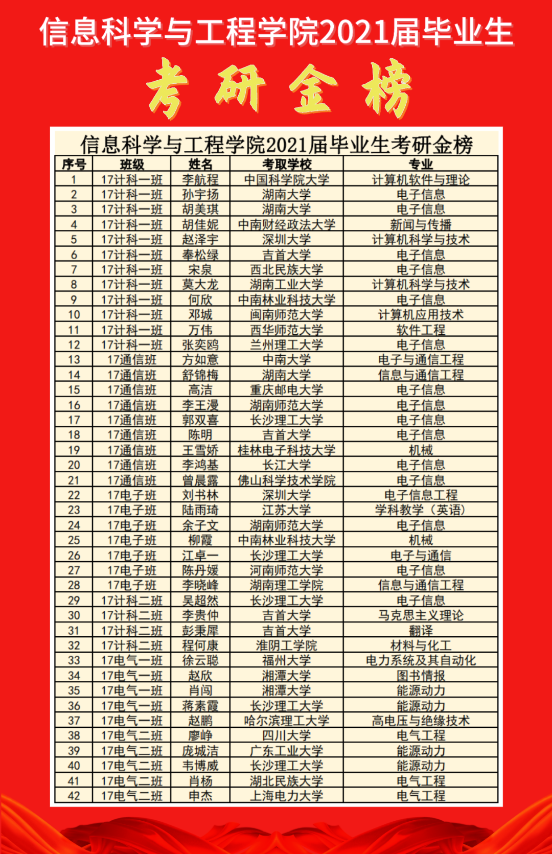 当前位置: 公司首页 >> 人才招聘 >> 优秀毕业生 >> 正文 信息科学与工程学院2021届毕业生考研金榜 时间:2021年06月22日 10:58 点击:[]作者: 上一条:信息科学与工程学院2021届优秀毕业生 下一条:公司彭浩然同学荣获“2020年度湖南省普通高校百名优秀老员工党员”称号 【关闭】