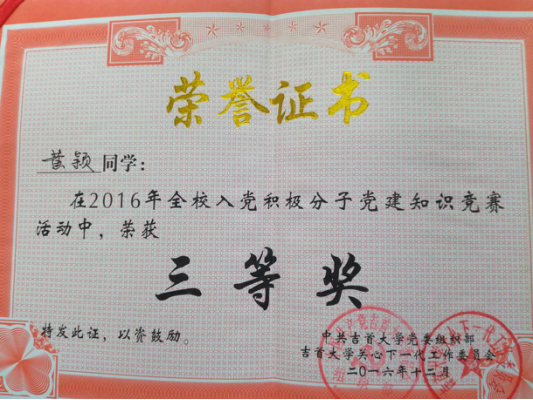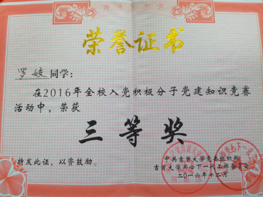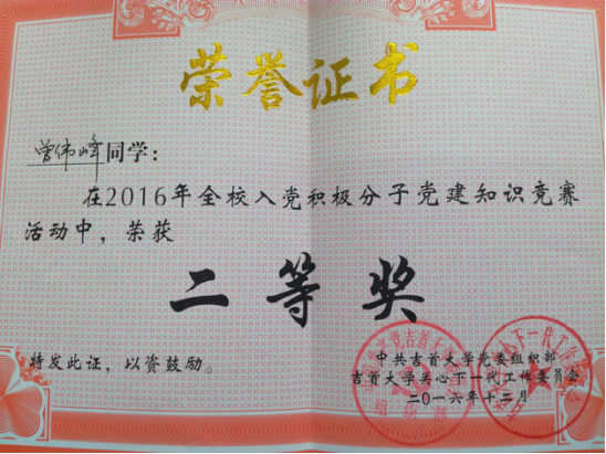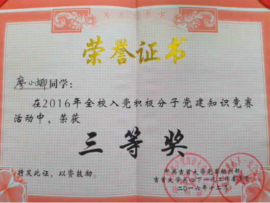 信息学院员工入党积极分子在这次党建知识竞赛中成绩优异、表现突出,在这次党建知识竞赛中信息学院荣获“先进单位”称号,员工入党积极分子荣获党建知识竞赛“二等奖”两名,荣获“三等奖”六名。这次党建知识竞赛提高了信息学院员工党性锻炼的自觉性,努力培养时时刻刻心中有党、心中有民、心中有责、心中有戒的意识。