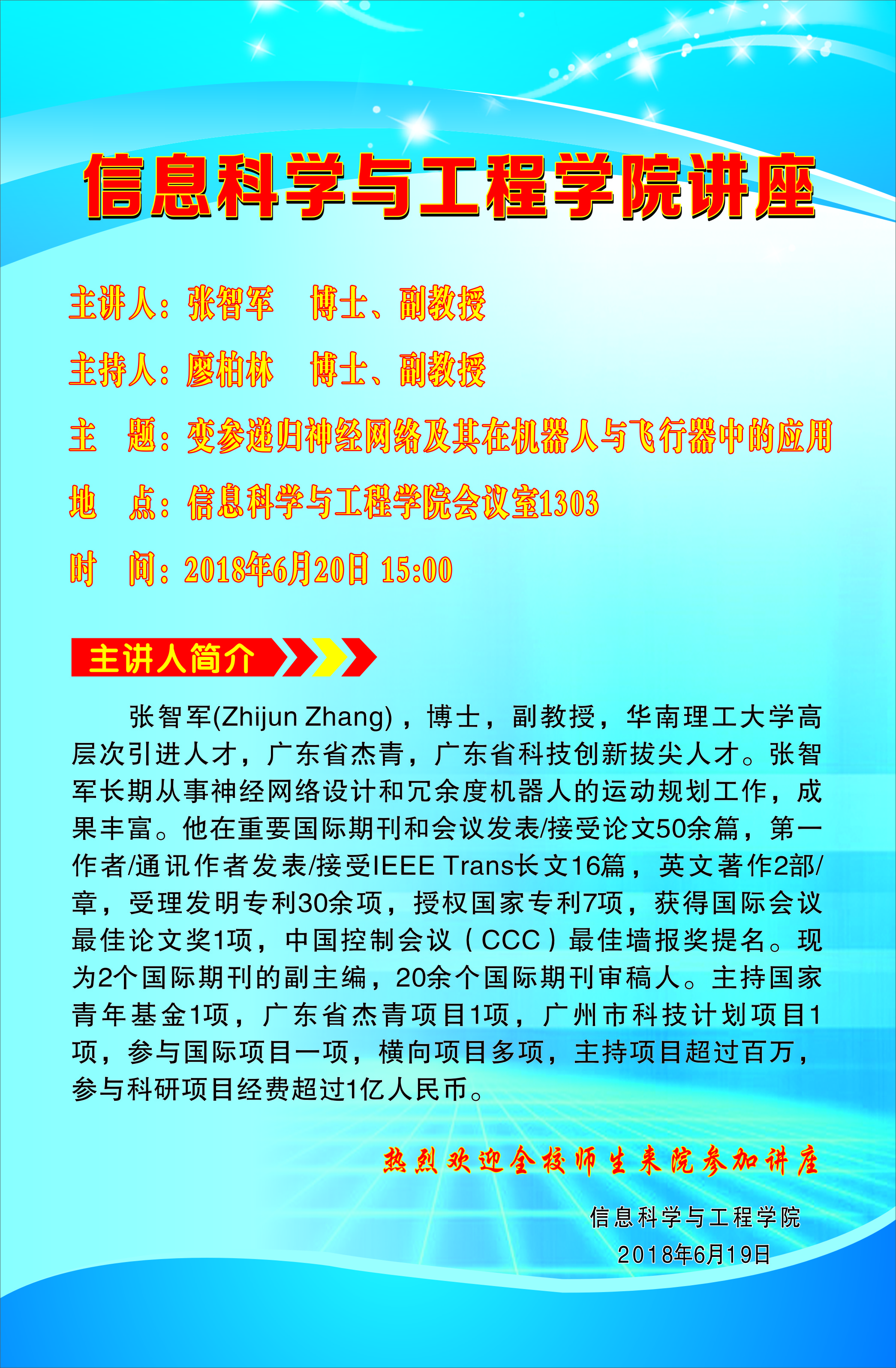当前位置: 公司首页 >> 学科与科研 >> 学术交流 >> 正文 学术讲座通知 时间:2018年06月19日 16:29 点击:[]作者: 题 目:变参数递归神经网络及其在机器人与飞行器中的应用 主讲人:张智军 博士、副教授 (华南理工大学) 时 间:6月21日,下午3点 场 所:信息科学与工程学院院会议室(1303室) 主 办:400白菜资讯最新平台信息科学与工程学院 上一条:信息科学与工程学院2019年系列学术会议讲座之一 下一条:公司第一届研究生学术活动节之“名家论坛”顺利举行 【关闭】