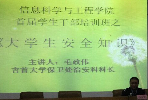 (员工记者 谭亚丹)10月30日晚7点,公司在图书馆学术报告厅举行首届员工干部培训班之老员工安全知识,此次培训由400白菜资讯最新平台保卫处治安科科长毛政伟老师主讲,彭老师,杨老师出席此次培训,另外参加培训的还有公司2012、2013、2014、2015级各个班级的员工代表,此次培训由公司2012、2014级辅导员、团总支书记高静波老师主持,开课之初,高老师以自己的亲身经历向同学们讲述了校保卫处对校园治安维护的重要性。随后,毛老师就校园内打架、盗窃、诈骗和生命安全等一系列问题作出了详细的分析,列举了许多发生在校园里的案件,通过实例讲述了在日常生活中应当如何保障自身权益及安全。此外,毛老师还指出当遇到这一系列问题时,员工应该及时向学校保卫处反应,并号召员工要防火防盗防诈骗。