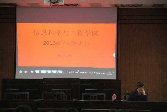 当前位置: 公司首页 >> 正文 信息科学与工程学院2013级毕业生大会 时间:2016年10月11日 00:00 点击:[]作者: 本网讯(员工记者 付蔷)10月10日中午,信息科学与工程学院2013级全体同学在总理楼模拟法庭举行了毕业生大会,会议由2013级辅导员杨川老师主持。本次大会,杨老师毕业生资格审查和毕业生推荐表的填写事项、毕业的条件、简历的制作和面试的技巧、招聘会的发动、离校前的安全、学费的催缴等方面详细地给同学们说明了有关13级同学们毕业的注意事项。 会后,杨老师虽然对即将毕业的同学们表达了不舍,但老师更希望看到的是她的孩子们能够顺利毕业,找到满意的工作,拥有更好的前途。 上一条:公司关于“学习刘延东同志在第十届中国青少年科技创新奖颁奖大会上重大讲话”会议 下一条:信息科学与工程公司党支部“两学一做”专题三“讲道德,有品行”讨论会 【关闭】