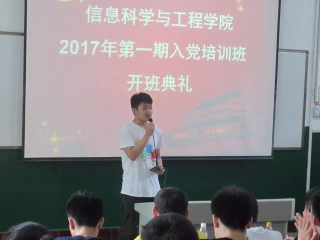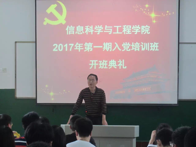 5月20日上午9点,信息科学与工程学院2017年第一期入党培训班开班典礼在新1206教室顺利举行,出席典礼的领导有公司党委书记周小清,党委副书记田清旺。在公司团总支组织部部长曾阳娟的组织安排下,参加本次党训班的73名成员按时到达现场,并积极投入到课堂中。典礼由党员代表刘鑫主持。