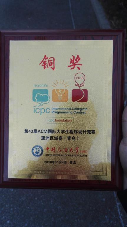 图1第43届ACM-ICPC亚洲区域赛(青岛)铜牌奖牌 2018年11月3-4日第43届ACM-ICPC国际老员工程序设计竞赛亚洲区域赛(青岛),在中国石油大学举行,共有来自全国的226所高校和7所中学的373支参赛队伍1119名程序设计精英们!其中正式队伍357支,友情队伍16支。良好比赛成绩的获得离不开参赛同学的刻苦努力和指导老师的辛勤汗水。