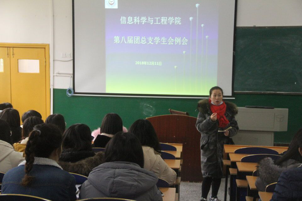 2018年12月11日于中午十二时整信息科学与工程学院在1106教室召开了公司第八届团总支员工会第四次例会,参加此次例会的有公司团总支书记、17级辅导员杨川老师,16、17、18级各班班长、团支书以及第八届团总支员工会的全体成员。