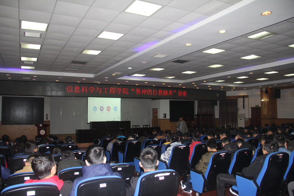 讲座开始,由信息科学与工程学院团总支书记杨川老师为讲座做开篇导语。随后,印宗祥老师从四个方面来让同学们深刻的了解到什么是“男神”,该如何成为“男神”,如何成为更好的男生从而进阶到“男神”的级别。风趣幽默的印宗祥老师以自己的亲身经历以及个人感悟,让同学们有了更为贴近自我的感受。紧接着,汪伟老师从节制和自律出发,分别讲到了作为一个男生,该如何应对私生活,该怎样在大学期间寻找伴侣,也提出了很多追求女生的误区。在场的男生听得津津有味,现场气氛活跃愉快,仿佛这更像是一场男生之间的“秘密座谈会”,而不是一板一眼的学术讲座。