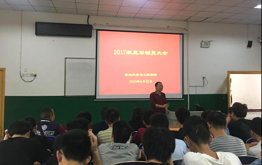 (通讯员包佳敏)2019年4月23日下午三点信息学院在1106举行2017级见习动员大会,出席本次大会的有公司党委书记黄生祥,公司党委副书记田清旺,学工办主任高静波,团总支书记杨川,2015级、2018级辅导员郑迅,辅导员助理宋凯老师公司各专业教研室老师代表段明秀、曾琳玲以及2017级计科一班、二班、通信班和电子班。