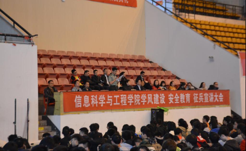 (通讯员董蔓君)2019年5月8日中午12点10分,信息科学与工程学院在砂子坳校区新体育馆内召开了学风建设、安全教育、征兵宣讲大会,参加此次会议的有公司保卫处治安科科长刘梓缘、公司党委书记黄生祥、公司党委副书记田清旺、学工办主任高静波、团总支书记杨川、各班班主任老师及16、17、18级全体同学。