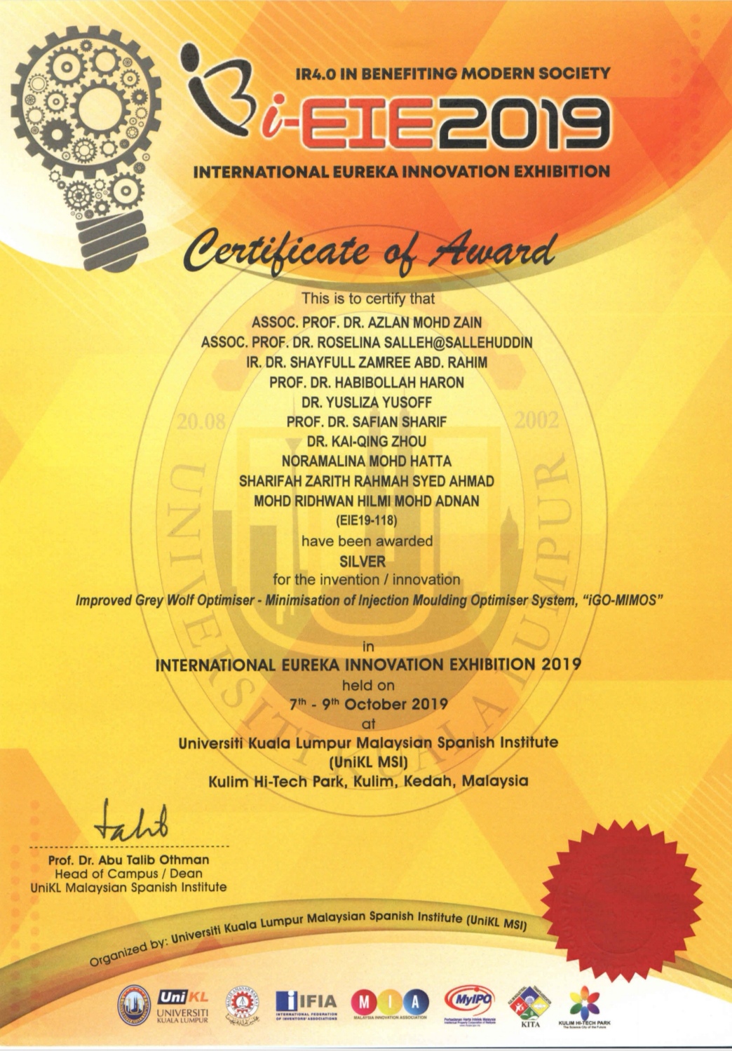 2019年10月12日讯,在马来西亚举办的i-EIE 2019国际发明博览会上,公司周恺卿博士参与,马来西亚理工大学(Universiti Teknologi Malaysia,UTM)计算机学院Azlan Bin Mohd Zain博士课题组发明的“IGO-MIMOS”斩获银奖。