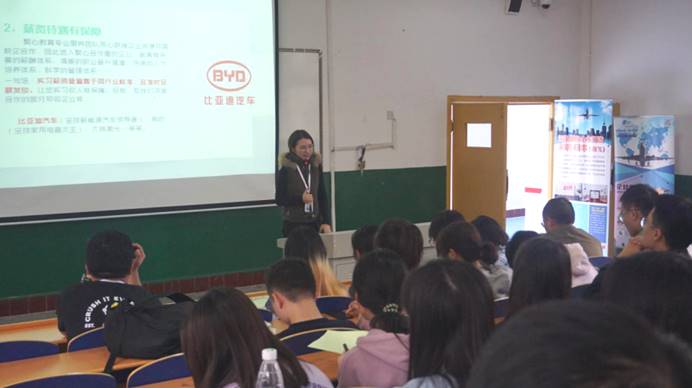 随后聚心教育集团的负责人介绍比亚迪股份有限公司的基本概况以及在未来全球市场的发展潜力,重点讲解了校招流程、公司的待遇以及人才培养方案。