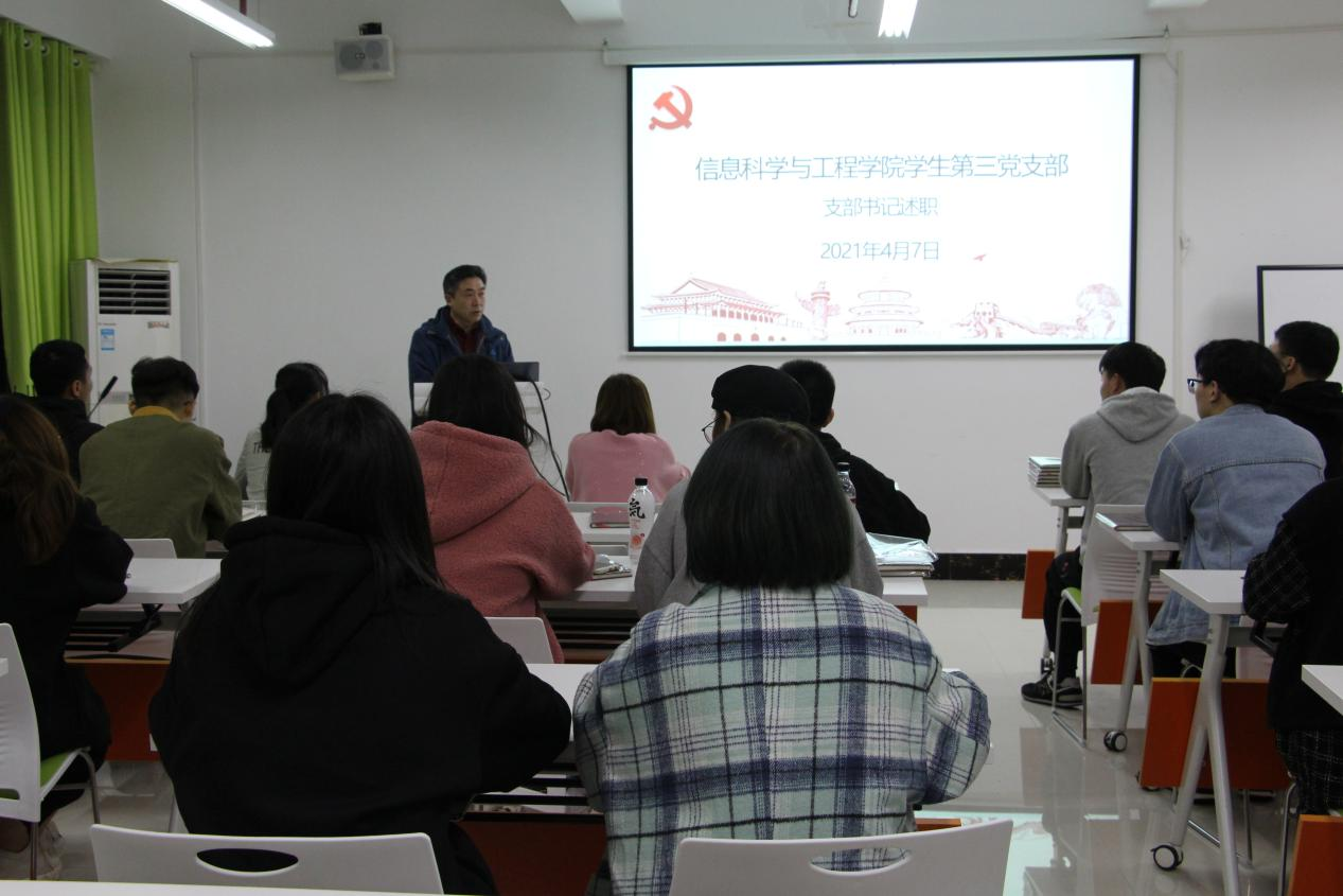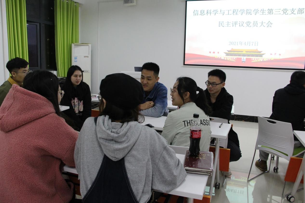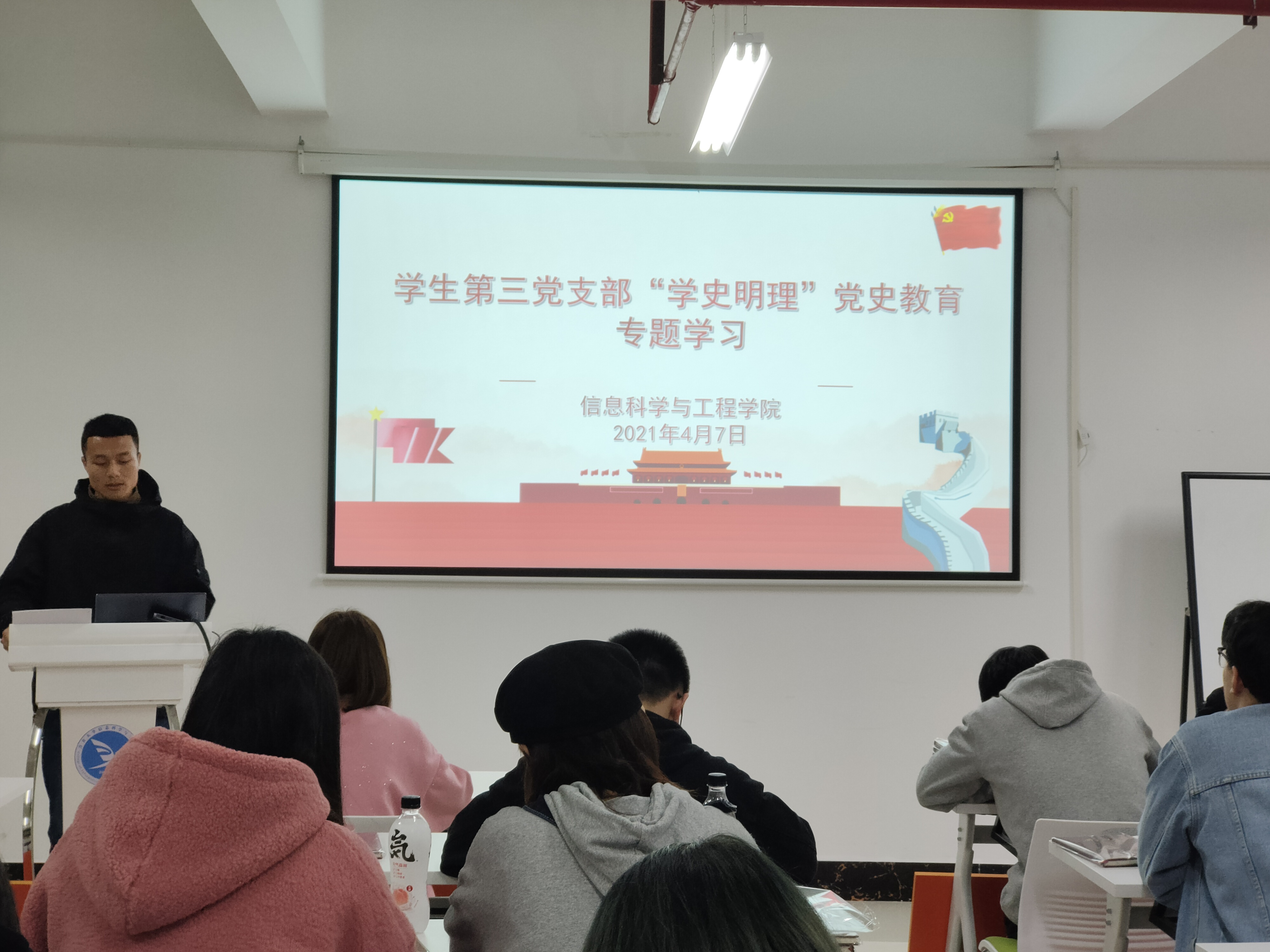 2021年4月7日19时,信息科学与工程学院员工第三支部在工科大楼C315教室召开了组织生活会暨党史学习教育专题会,参会人员有公司党委书记黄生祥、员工第三党支部书记何剑以及全体员工党员,本次会议由员工第三党支部书记何剑主持。
