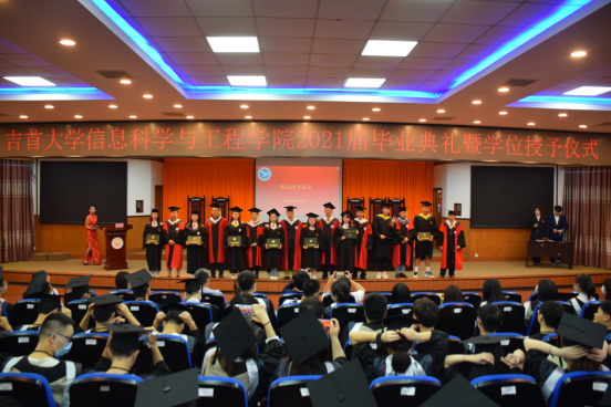 在随后的学位证书授予仪式中,毕业生分批次上台,他们接过主礼教授授予的学位证书后与他们进行合影。目光的交接、轻声的祝福、帽沿微微摇动的穗子,四年间的回忆碎片不时的闪过,典礼现场洋溢着温暖和纯粹的感动。