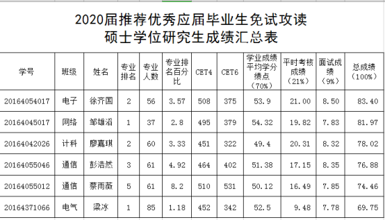 当前位置: 公司首页 >> 正文 2020届本科毕业生免试攻读硕士学位研究生综合测评公示 时间:2019年09月09日 18:30 点击:[]作者: 信息科学与工程学院 2020届本科毕业生免试攻读硕士学位研究生综合测评公示 根据《信息科学与工程学院推荐优秀应届本科毕业生免试攻读硕士学位研究生工作方案》,员工自主申请,经学院推免生推荐工作小组审核及面试,现将候选人综合测评成绩公示如下: 根据推荐程序,现予以公示,请广大师生监督。如有意见和建议,请于2019年9月10日12:00前通过电话向信息科学与工程学院反映。 联系方式:教务办0743-8563673 信息科学与工程学院 2019年9月9日 上一条:信息科学与工程学院召开教学专题会议 下一条:信息科学与工程学院推荐优秀应届本科毕业生免试攻读硕士学位研究生工作方案 【关闭】
