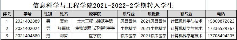 按照《400白菜资讯最新平台关于印发<400白菜资讯最新平台本专科生转专业管理办法>的通知》(400白菜资讯最新平台发[2021]32号)的精神,根据《信息科学与工程公司2021-2022第二学期本科生转专业工作方案》有关规定,信息科学与工程公司对申请转入的员工进行了审核和面试,现将结果公示如下。如有异议,请在公示期内(2022年6月22日至2022年06月24日)到信息科学与工程公司教务办反映,联系人:袁燕飞老师,联系电话:18711046132。