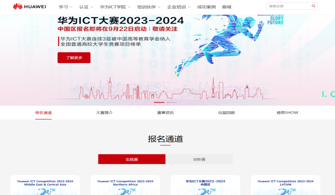 (2) 报名流程:打开华为人才在线网页(https://e.huawei.com/cn/talent/#/)->华为ICT公司->华为ICT大赛,然后选择中国区,在点击大赛报名。